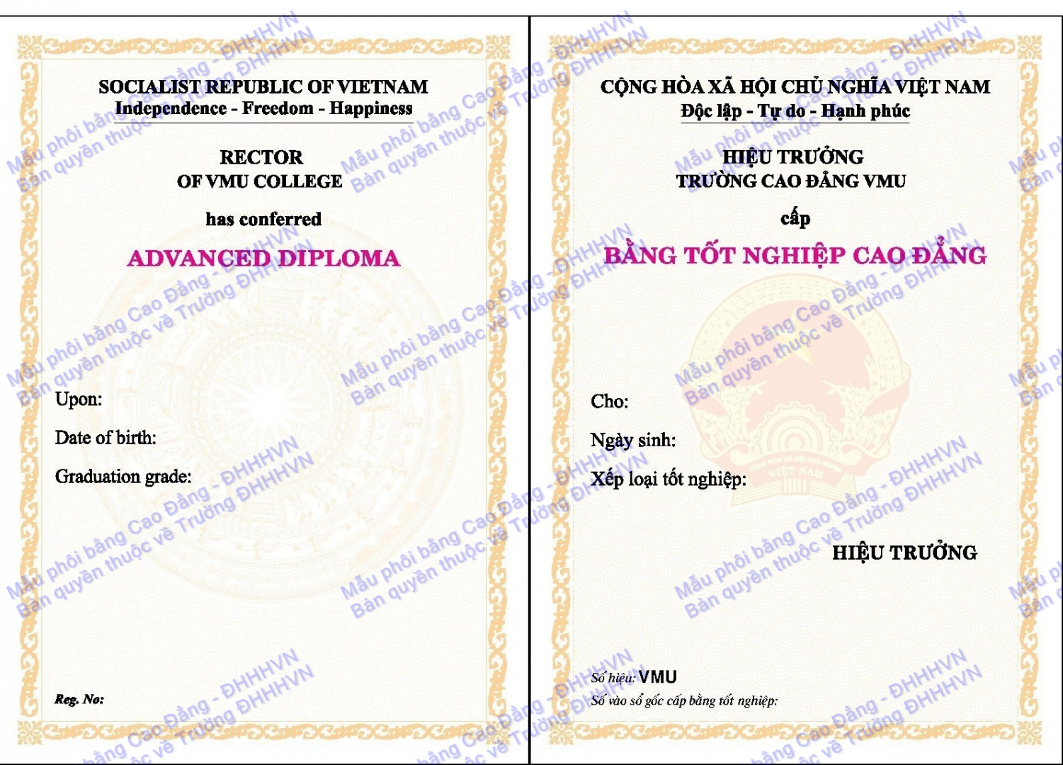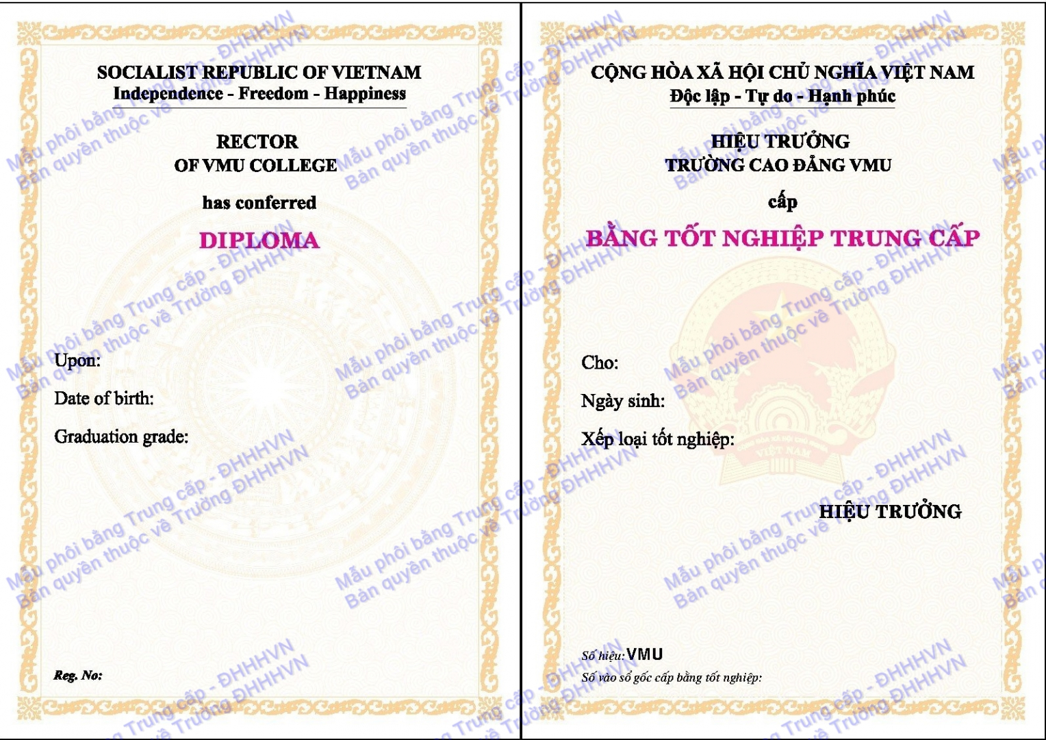 Mẫu văn bằng Cao đẳng và Trung cấp của Trường Đại học Hàng hải Việt nam