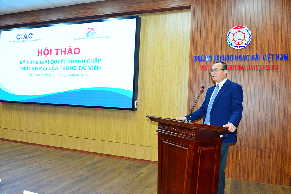 Trong không khí trang trọng, phấn khởi hướng tới kỷ niệm 70 năm Ngày thành lập Trường (01/4/1956 - 01/4/2026), sáng 20/3/2026, Trường Đại học Hàng hải Việt Nam phối hợp cùng Trung tâm Trọng tài quốc tế vùng Duyên hải (CIAC) tổ chức Hội thảo chuyên đề: “Kỹ năng giải quyết tranh chấp thương mại của trọng tài viên”.
